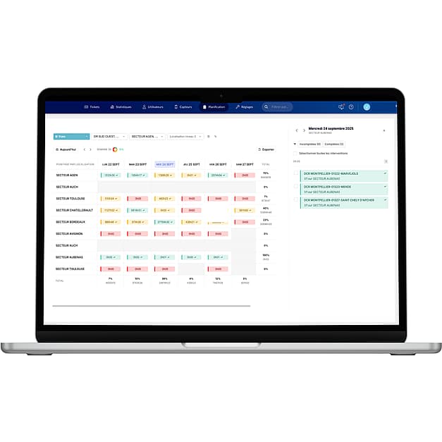 Le calendrier est conçu pour piloter à distance : la présence sur site des agents et/ou la bonne réalisation des prestations quotidiennes et périodiques. Par mail et notification push (sur PC et smartphone) en cas de retard, absence, départ anticipé, d’oubli de prestations planifiées, mais aussi de demande d’intervention ou de repasse à l’usage.