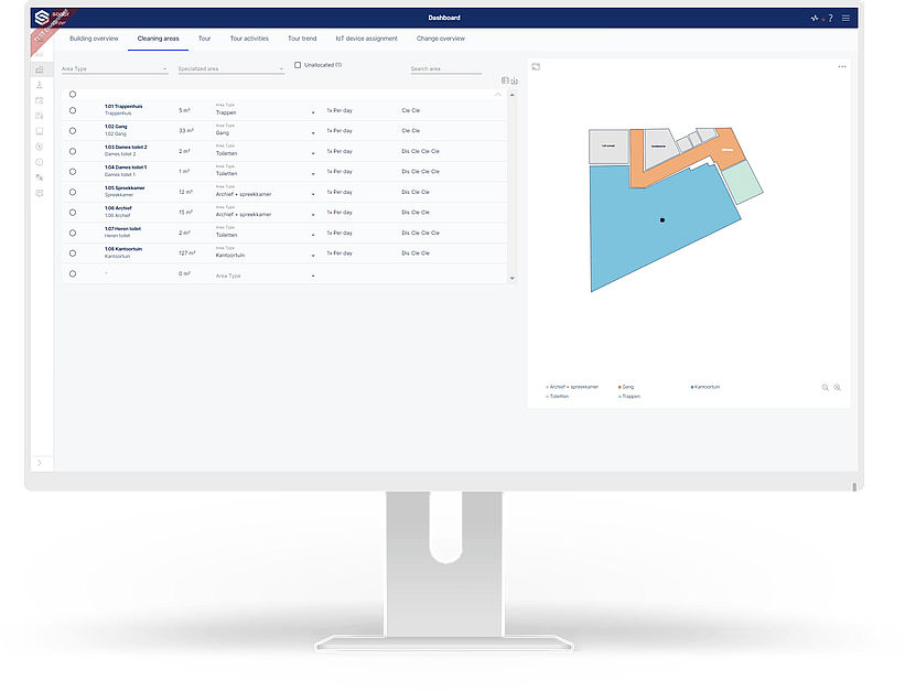 The entire planning of cleaning tours takes place in the web application. Using existing service specifications, building and sensor data, the actual cleaning requirements are determined automatically. The result: perfectly planned tours with minimal effort. Paper-based cleaning tours and time-consuming planning are no longer necessary with the Soobr complete solution. All work carried out can be tracked in real time in the dashboard. For optimized cleaning of the entire portfolio!