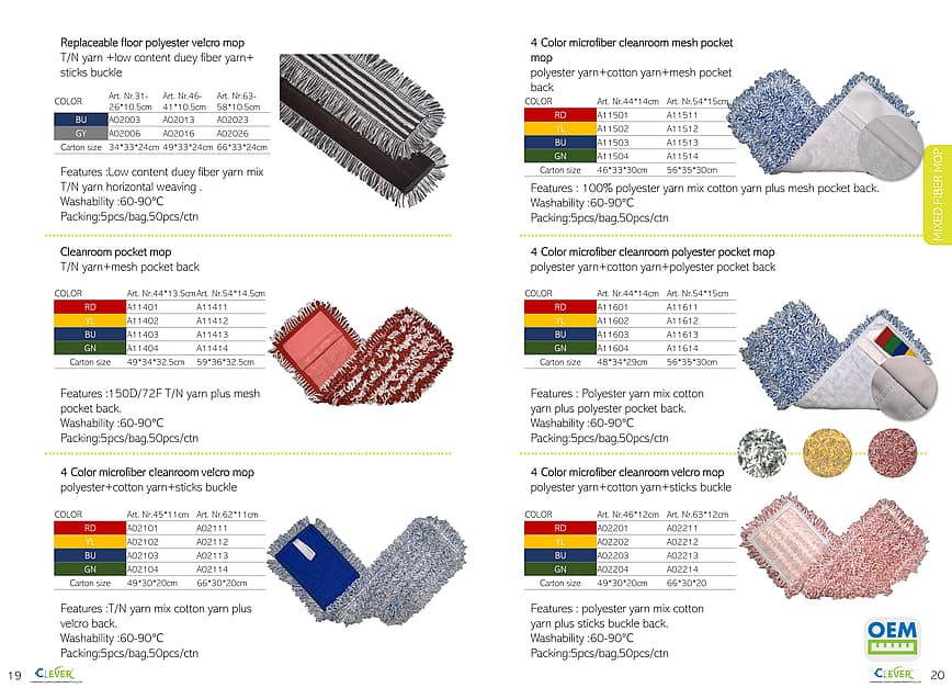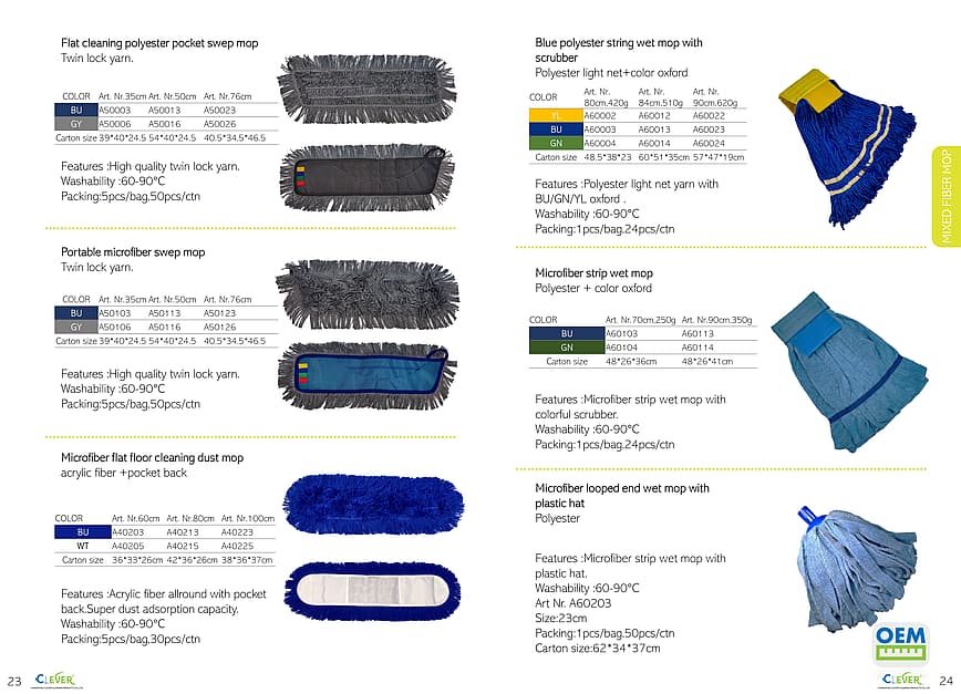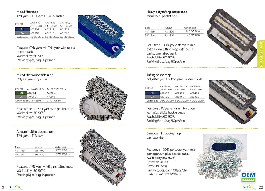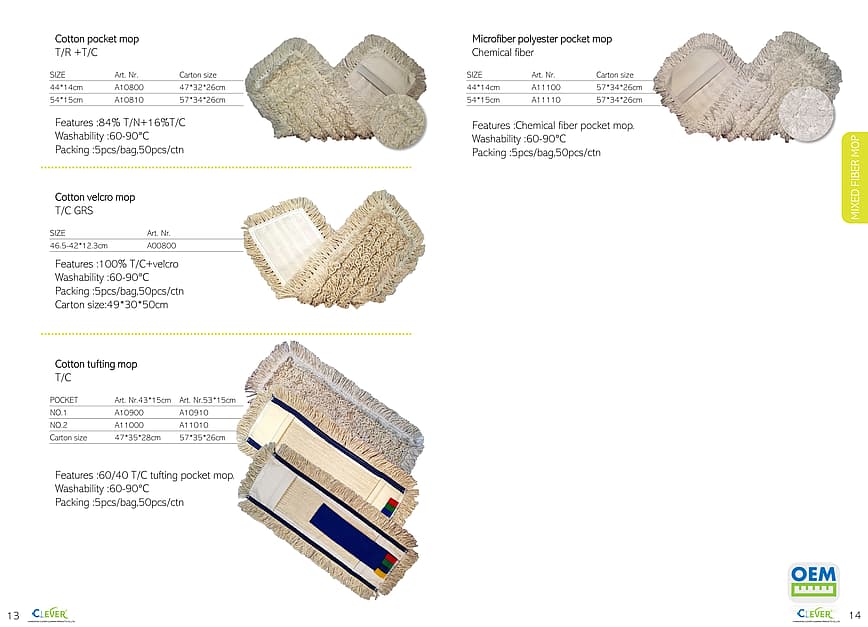 Various styles of industrial mops, including flat mops and pocket mops, support customization.