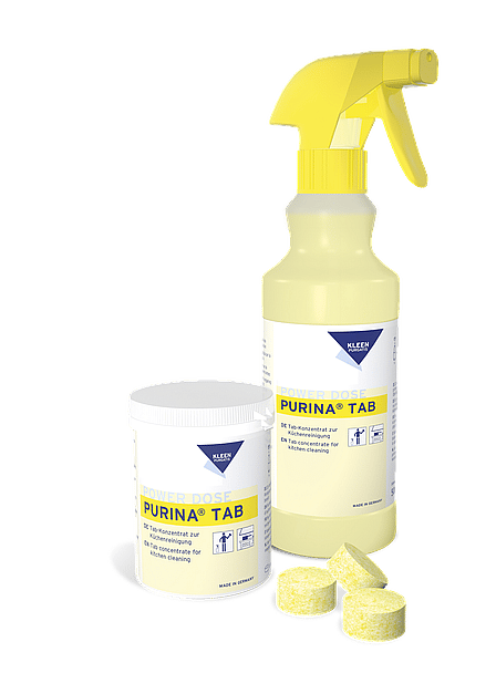 PURINA TAB is a highly active tab concentrate for kitchen cleaning. Add one tab in a bottle with 500ml of water to prepare a powerful cleaning solution. The key benefits of PURINA TAB are: • 1 can with 50 tabs (= 150g) equals 25kg of regular cleaners • No carrying of heavy bottles • No training needed • Easy & safe handling and use • Pre-dosed: no dosing device, no overdosing • Time-efficient preparation of cleaning solution during cleaning routine • Space-saving storage on cleaning trolley