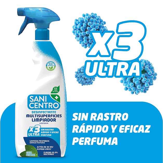 Sanicentro Multisurface disinfectant cleaner spray cleans every surface of the house with a fresh fragance. The bleach-free formula kills 99,9% bacteria in just 30 seconds, fungi and viruses* and cleans without trace. The Eco-bottle, 100% recycled and recyclable helps to separate and reduce the impact on the enviroment. (*Adenovirus type 5 and Murine Norovirus according to UNE-EN 14476)