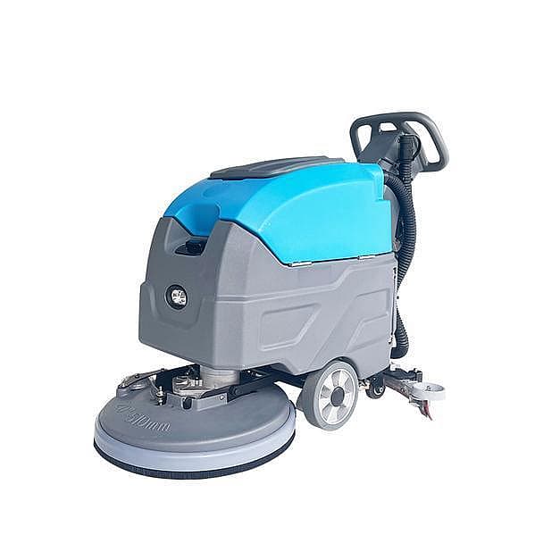 The working principle of a floor scrubber is a combination of "wet cleaning + dry vacuuming". The brush rotates at high speed, using clean water to rinse the floor and break down stains. At the same time, it washes and vacuums simultaneously, using strong suction to immediately suck the mixed dirty water and dry and wet garbage into the wastewater tank. Finally, the scraper dries the floor, achieving simultaneous cleaning and vacuuming.