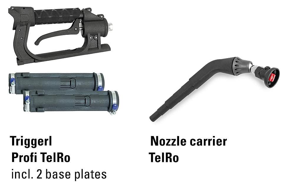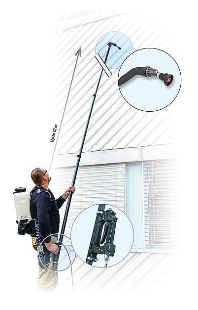 The TelRo system addresses key challenges in professional facade and window cleaning by replacing complex high-pressure methods with a controlled low-pressure approach. It improves ergonomics when working with long telescopic lances, allows secure one-hand operation of lance and valve, and enables fast, tool-free switching between different telescopic lances. This results in greater efficiency, reduced chemical use, less surface stress, and improved working comfort on site.