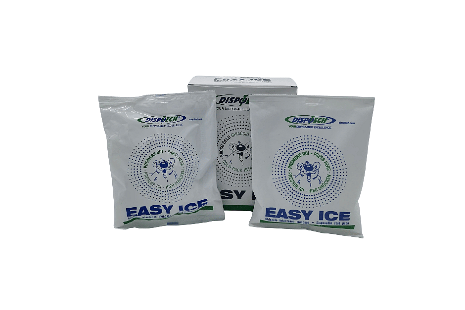Single-use instant ice produced in two materials: polyethylene for a more intense cold or soft-touch nonwoven fabric, designed for sensitive body areas. Pressing the internal bubble triggers an instant endothermic cooling process using Dispotech's exclusive patented formula. Ideal for medical, first aid, and Private Label. Class IIa medical device.
