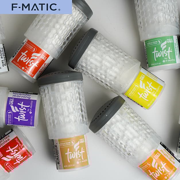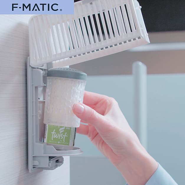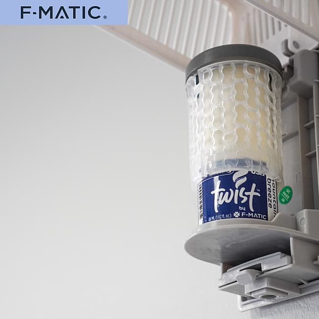 F-MATIC Twist® delivers true 60-day air care performance through patented gravity-powered liquid technology. Unlike solid air fresheners that fade after 2-3 weeks, Twist maintains consistent fragrance strength throughout the entire lifecycle. Its battery-free operation requires zero maintenance, while the universal design fits all standard passive air freshener dispensers. Available in 12 premium fragrances, Twist is ideal for high-traffic facilities demanding reliable odor control.