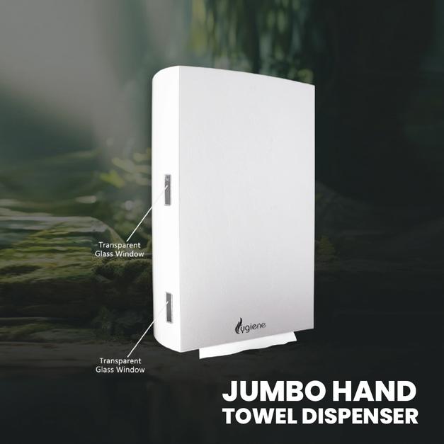 Dispensing one hand towel with each pull, this dispenser prioritises maximum hygiene by minimises cross-contamination. Shielding the hand towel stack from germs and water splashes, this dispenser is ideal to be placed next to washroom spaces. With thorough protection and one-sheet dispensing, this dispenser can lower the cost-in-use by up to a whopping 30%. That's right! With the Jumbo Hand Towel dispenser, you get to have clean hands and a heavy purse.