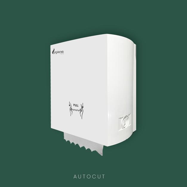 Tear off sheets of soft towels from the Hygiene auto cut dispenser. A wall-mounted dispenser to manually dispense hand towels with each pull.
