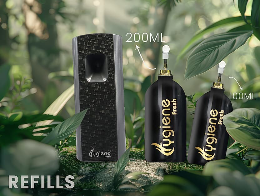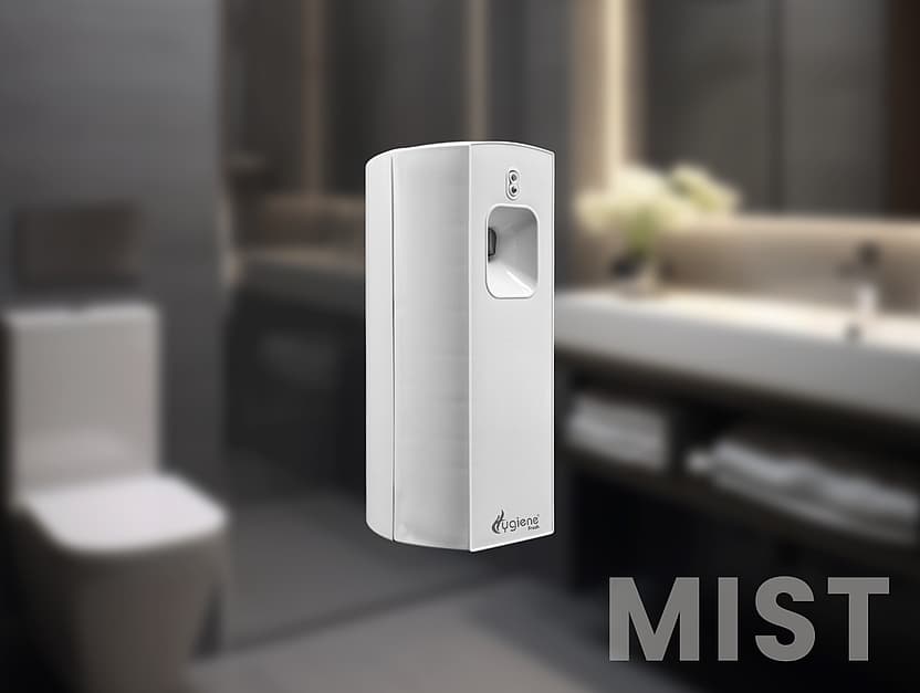 Introducing the Hygiene Fresh Mist Dispenser – designed to effortlessly keep your washroom smelling fresh and inviting. • With advanced misting technology and a luxurious, long-lasting fragrance, it neutralizes odors instantly, ensuring a fresh atmosphere at all times. • No more worries about stale air – just continuous freshness and a welcoming environment for all. Transform your washroom into a refreshing haven with the Hygiene Fresh Mist Dispenser.