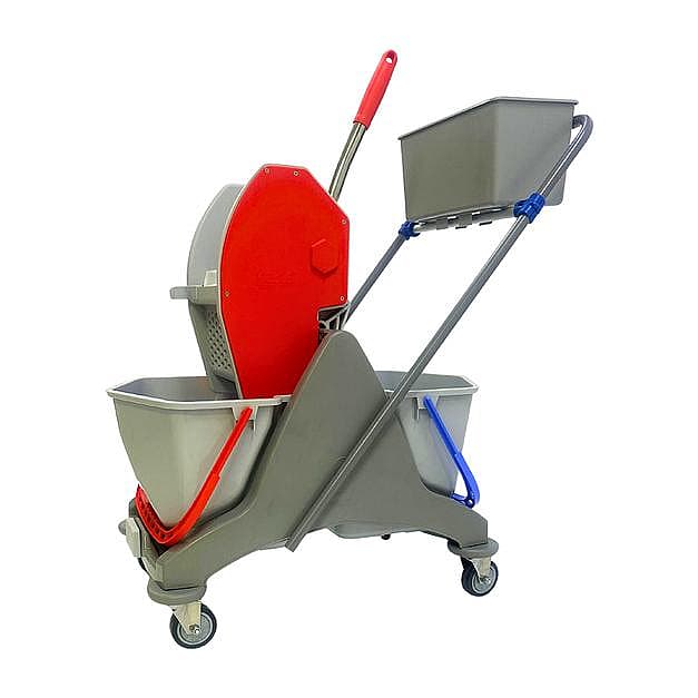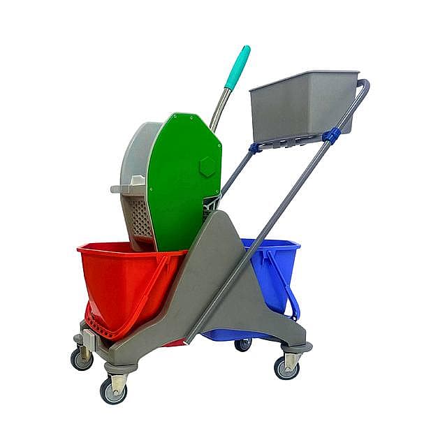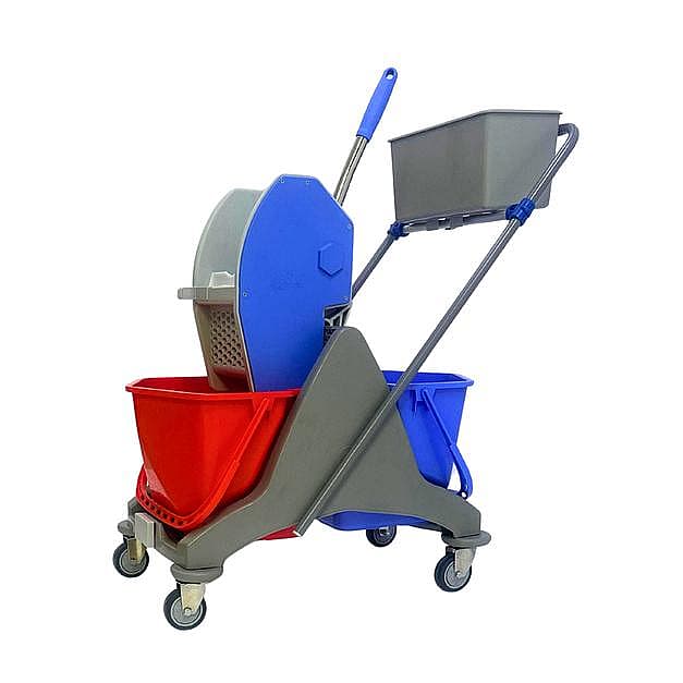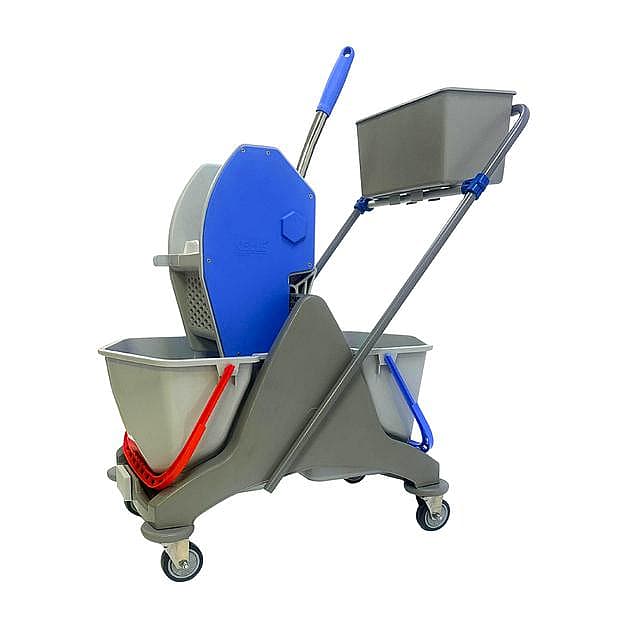 The double-bucket wringer trolley features dual separate buckets for clean and dirty water, ensuring more hygienic and efficient floor cleaning. Its down-press wringer quickly removes excess water from mops with less effort, reducing drying time and slips. The added caddy keeps cleaning tools organized and within reach. Durable construction and smooth wheels make it ideal for hotels, hospitals, offices and large spaces.