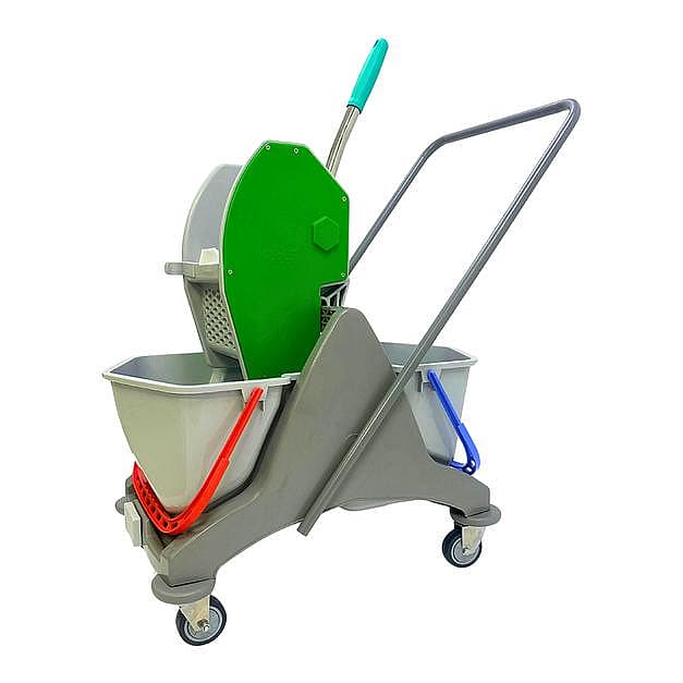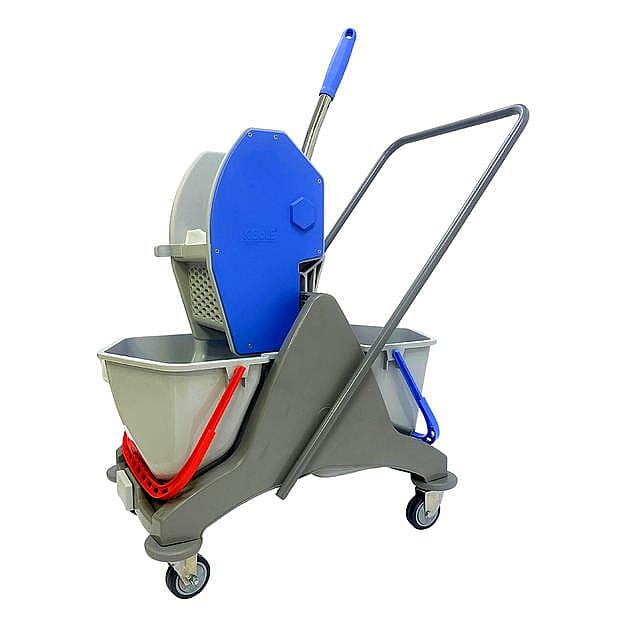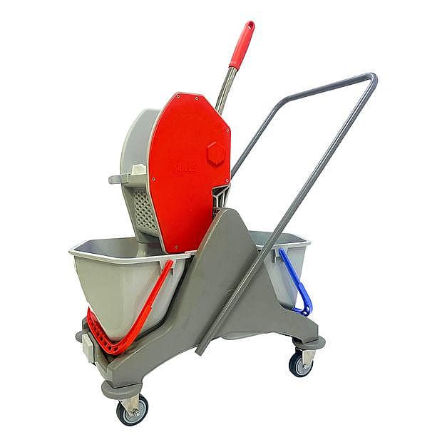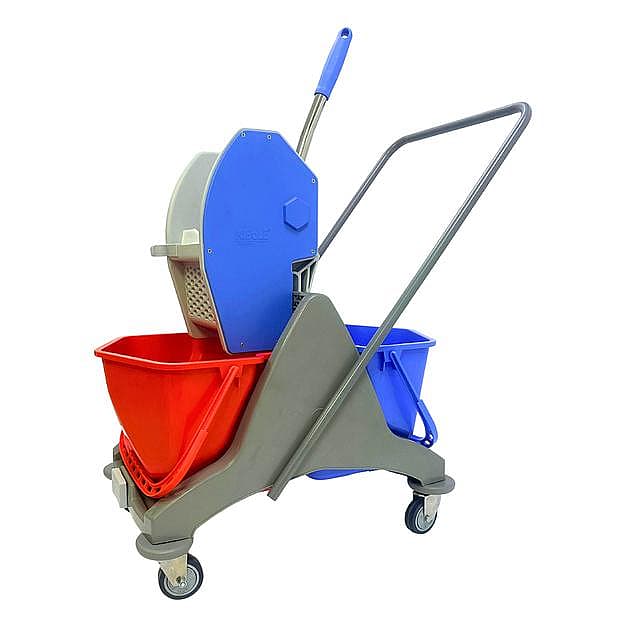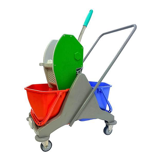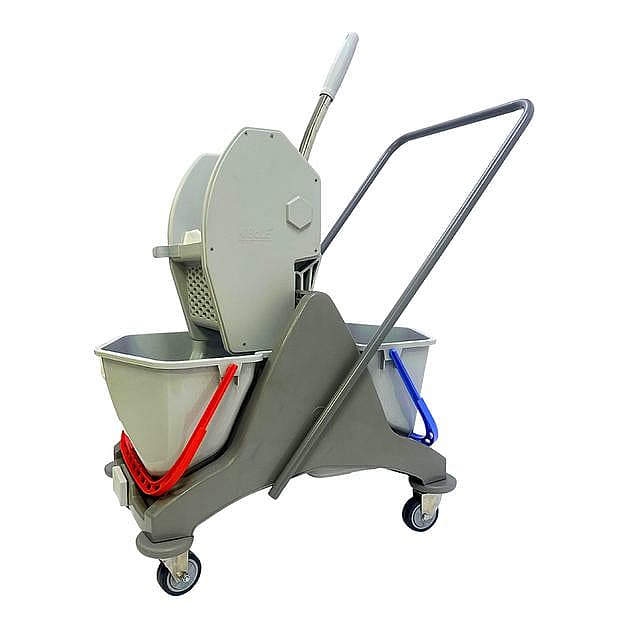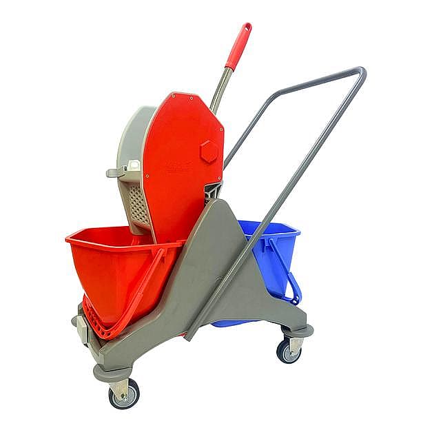 The Double Bucket Down Press Wringer Trolley is a professional floor cleaning trolley with dual buckets to separate clean and dirty water, promoting hygiene and efficient cleaning. Its down-press wringer effectively removes excess water from mop heads, reducing drying time and slip risks while minimizing effort. Designed for commercial use, it’s sturdy, easy to maneuver, and ideal for hotels, hospitals, schools, offices and large spaces.