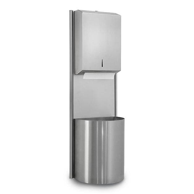 Wall-mounted stainless steel waste unit with 400-sheet paper capacity and 23 Lt bin capacity.