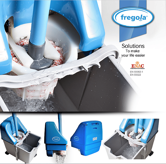FREGOLA is a battery-powered automatic wringer designed to replace traditional manual mop squeezing. It applies up to 60 kg of pressure through a sensor-activated system, delivering consistent and efficient results. Reduces physical strain on wrists and forearms, improves hygiene and speeds up drying time. Up to 700 wringing cycles per charge. Manufactured in Spain.