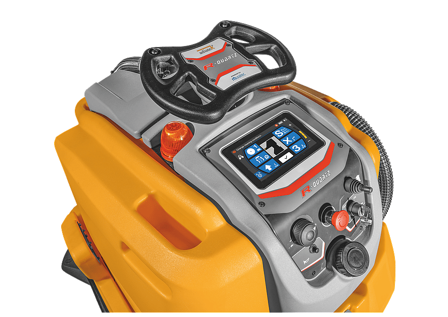 This model in fact provides the innovative possibility to work without the constant presence of the operator. Thanks to its two modes it is possible to perform the cleaning by repeating a route that was previously memorized by the machine, or to clean the inner area of a perimeter previously run by the operator. The lithium batteries autonomy allows to operate independently for more than 4 hours with just one change of the detergent solution.
