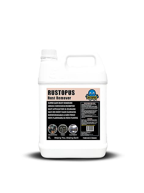 Rustopus Rust Remover is a safe, eco-friendly solution that removes rust effectively while protecting surfaces and the environment. Using chelation and mild acidic action—without harsh acids—it eliminates rust from most hard surfaces. Green corrosion inhibitors help prevent flash rust, while the non-toxic, biodegradable, non-flammable, and non-fuming formula ensures safe, convenient use with no compromise on performance.