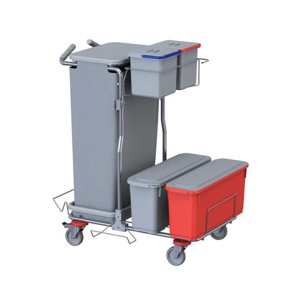 The SMART 2 TOP INOX trolley is part of the SMART line, it has quickly become one of the most appreciated service trolleys, renowned for the lightness and sturdiness of its frame constructed from round-profile tubular stainless steel AISI 304. It is equipped with four 100 mm pivoting metal wheels, two of which have brakes. It features a cleaning system with pre-impregnated mops, with buckets and plastic lids. This model is more accessorized compared to the standard version, offering greater func