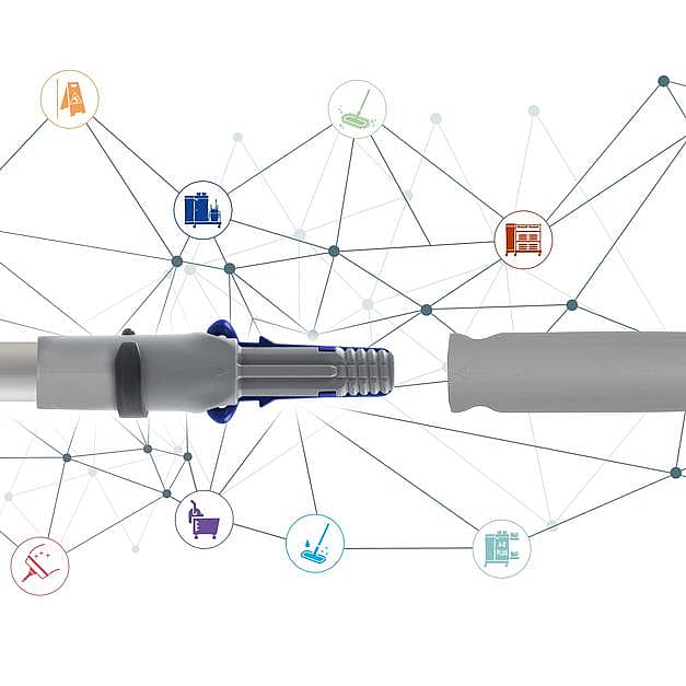 Innovative universal connection system that allows you to easily and quickly attach the same handle to any cleaning equipment.