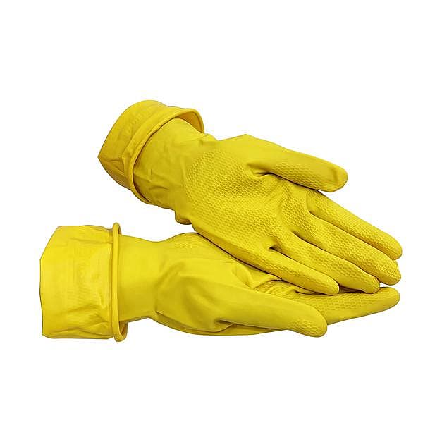 Yellow rubber gloves offering strong grip, flexibility, and protection against water, chemicals, and dirt for safe cleaning tasks.
