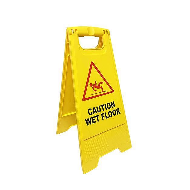 Bright yellow foldable A-frame sign with bold “Caution Wet Floor” text and slip icon. Durable, lightweight, and highly visible for safety alerts.