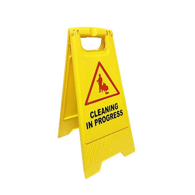The Cleaning in Progress signage is a bright yellow safety sign designed to alert people that cleaning activities are underway. It features bold, easy-to-read black text for clear visibility from a distance. Made from durable, lightweight plastic, it is easy to carry and reposition as needed. The foldable A-frame design ensures stability during use and convenient storage afterward. Ideal for hotels, offices, malls, hospitals, and washrooms, it helps maintain safety.