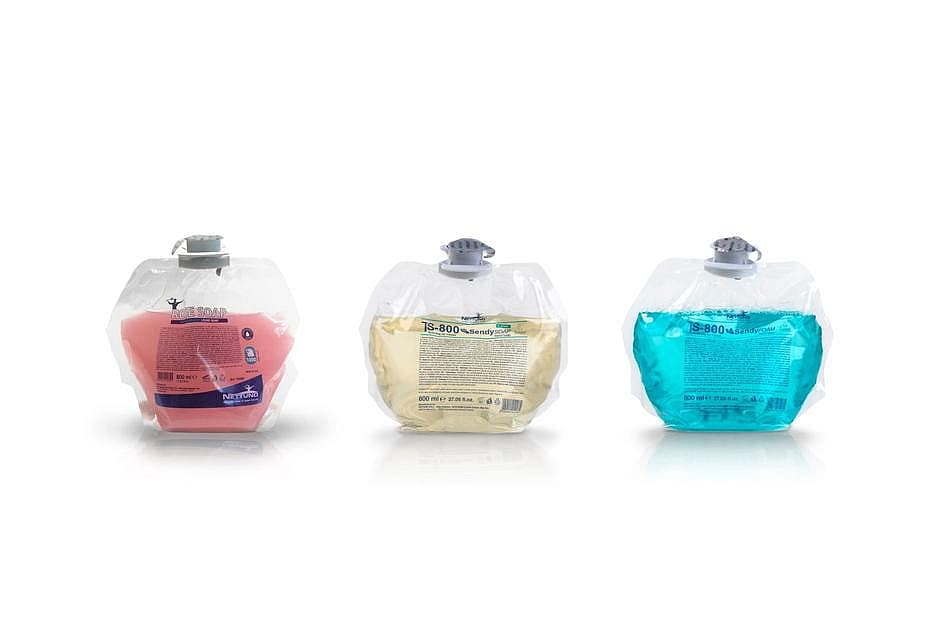 T-S800 is our 800 ml refill pouch range for Nettuno T-Small dispensers, ideal for offices, schools and communal environments. The line includes Rose Soap, a liquid soap enriched with emollients and a delicate honey scent; Sendy Soap with Aloe Vera, Ecolabel certified and CIT/MIT free; and Sendy Foam mousse, Ecolabel certified, CIT/MIT free and gentle on skin. All formulas are suitable for frequent washing and light dirt.
