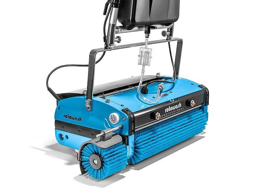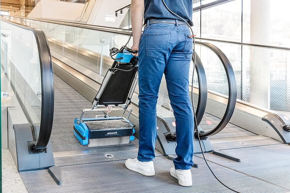 Rotowash Escalator makes it possible to thoroughly clean escalator treads and perimeter walkways. The machine washes, scrubs and dries in a single step, collects the dirt and immediately reabsorbs the water. A side brush is part of the basic equipment for the ESC models and is included in the scope of delivery.