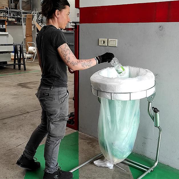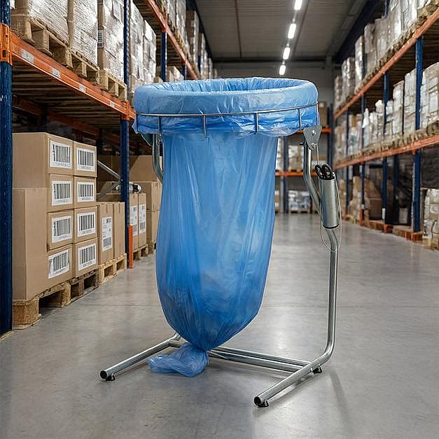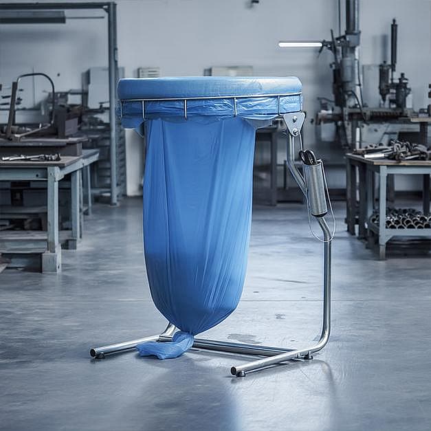 Specifically designed for warehouses and industrial sites, the Jumbo dustbin features a robust steel build and a high-capacity continuous bag system for bulky packaging waste. The adjustable bag adapts to shift needs and swells without barriers. A reducer prevents waste from expanding upwards, keeping areas clean. With each sealed bag, a new one is instantly ready—cutting bag change time by 50% and improving comfort and efficiency in waste collection.