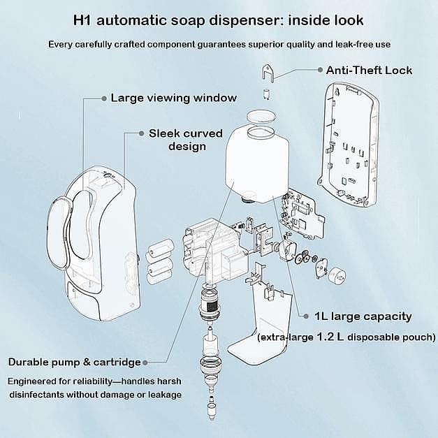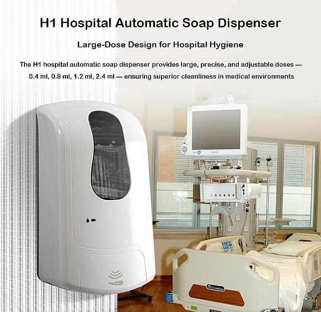 The H1 Automatic Soap Dispenser is a premium, hands-free hygiene solution designed for high-demand environments such as hospitals, clinics, educational campuses, commercial buildings, and airports. It features a 1,000 ml refillable capacity, compatible with various cartridge types including bottles and pouches, to support uninterrupted usage and cost-effective maintenance.