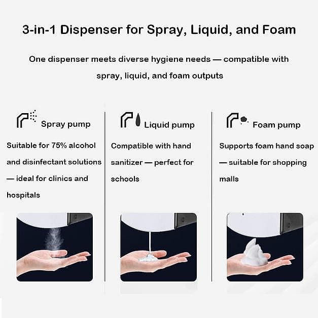 Six pumps for precise dosing: liquid 0.6/1.0 ml, foam 0.4/0.7 ml, spray 0.4/0.9 ml