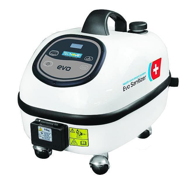 Steam cleaner designed specifically for the healthcare sector, capable of deeply clean critical surfaces within hospitals, aged care facilities, medical, dental and veterinary practices. Evo Sanitizer is equipped with a stainless-steel boiler and is able to deliver dry saturated steam at 165° C, with 6 bar pressure and an internal tank for a continuous water feed. Its compact structure makes it possible to access even narrow spaces. Equipped with cable holder and anti-scratch wheels.