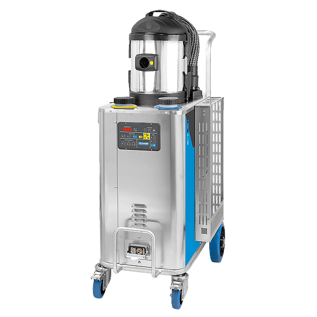 Steam cleaner with stainless-steel body and boiler, designed for industrial use and able to deliver dry saturated steam at 183° C. The unit is equipped with a wet/dry vacuum cleaner with a 1-kW vac cleaner with induction turbine. A sturdy structure, a fully electric operation and the compact size allows its a usage in any environment, both outdoors(watertight protection IPX5) and indoors (e.g. in production lines). The unit can be paired with a variety of tools for heavy-duty cleaning operations