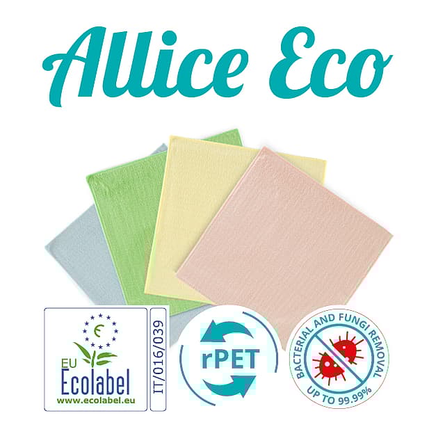Allice Eco is an unbeatable multipurpose textile microfibre cloth. EU Ecolabel certified, it is now available in recycled polyester and tested for very low microplastic release. Versatile on any surface, it drastically reduces water and detergent use. Its mechanical action guarantees extremely high-performance cleaning, effectively removing dirt and 99.9% of Coronavirus 229E.