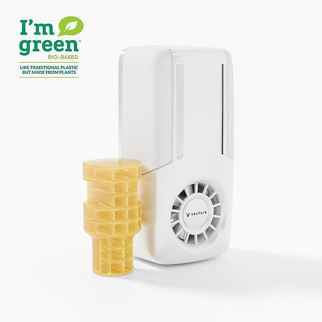V-Air Flow provides reliable 30-day fragrance in a simple, sustainable system. A 100% recycled plastic dispenser evenly distributes scent using intelligent fan technology, while plant-based refills made with more than 50% EVA from sugarcane support environmental goals. No programming needed for easy, efficient aircare.