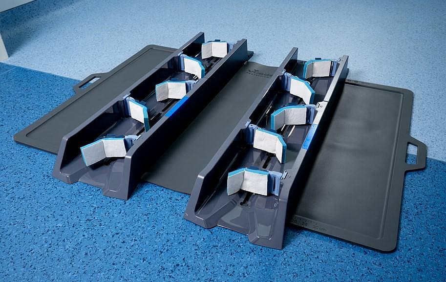 Wheels and wheeled equipment are notorious and often-overlooked sources of cross-contamination. Moving from less-clean environments to more hygienic spaces, wheels bring contamination with them, and they are difficult to clean easily, effectively, and ergonomically. TraXero® delivers a 99.99% reduction in bioburden with just a simple push through the tracks of light-duty material transfer equipment. No more kneeling, bending, or stooping. Stop cross-contamination in its tracks with TraXero®